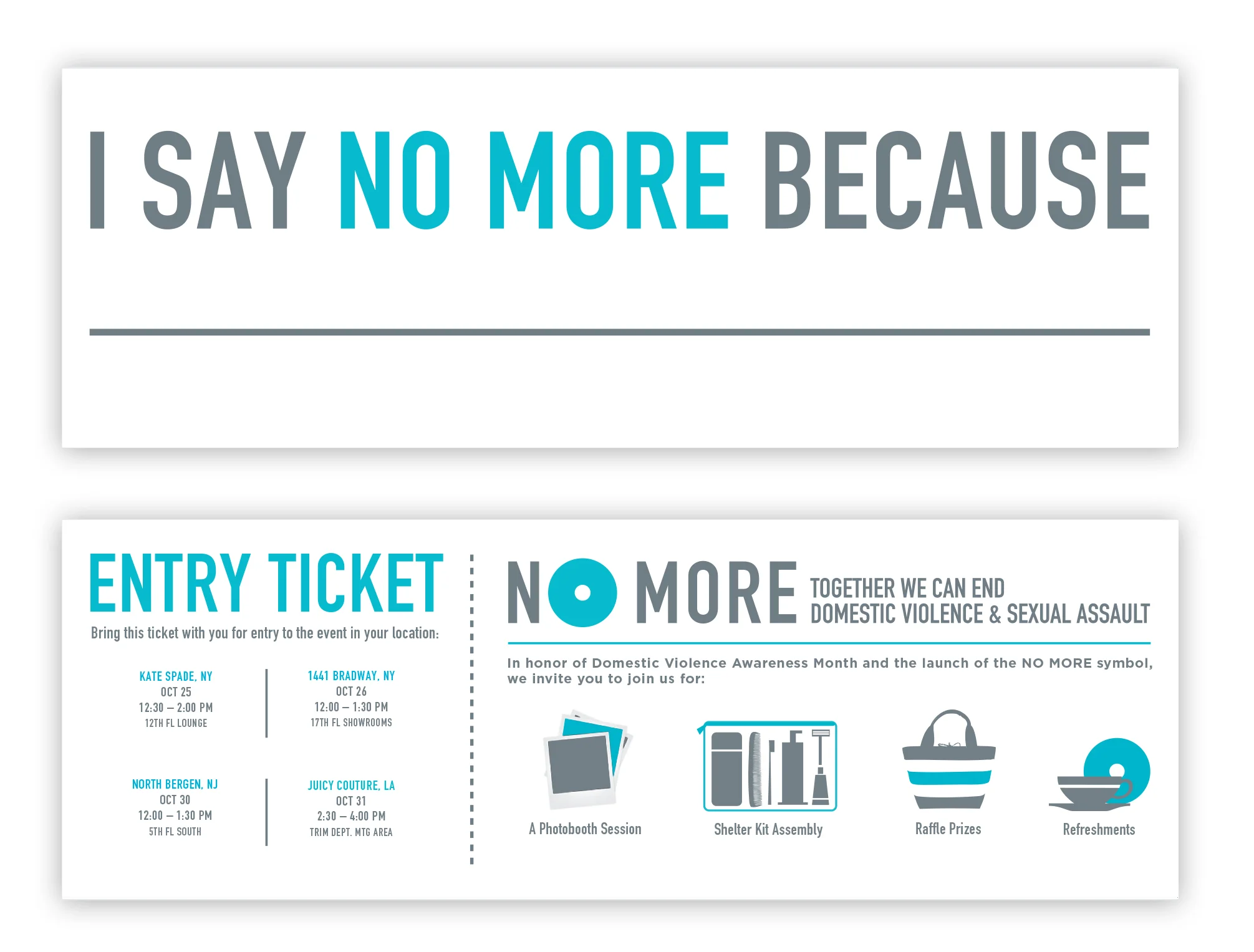 NO MORE month. Designed co-branded event collateral that included activities such as a toiletry drive for Sanctuary For Families and other event activities. This was the first company-wide event which introduced NO MORE to raise awareness on domestic violence and sexual assault. Many of the designs developed here ended up becoming part of the NO MORE tool kit, including the sign idea "I say no more because____".