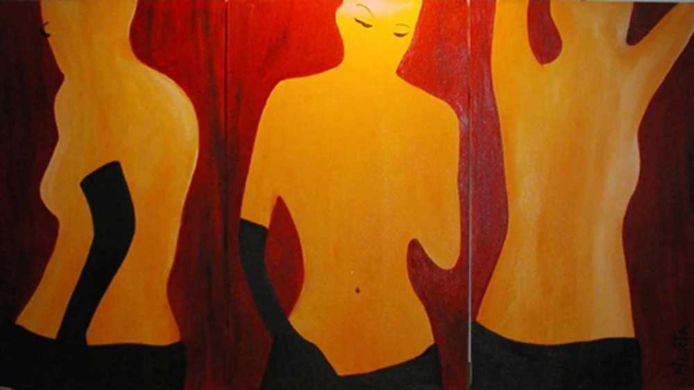 Herta used to have group art shows there with Maxstyle.tv when she first moved to NY. She sold her first painting to the restaurant, a triptych of showcasing red, yellow and black gloved bodies. Soon after, one of the 3 panels were stolen and Herta was approached for a new commission. Herta then created a diptych, also part of the original bodies series, in black, red and white. Essex also acquired “A Hairy Situation”, a multi-media piece in black and red, where Herta adhered synthetic hair to the canvas for textural interest and “a playful take on hair at a restaurant”.