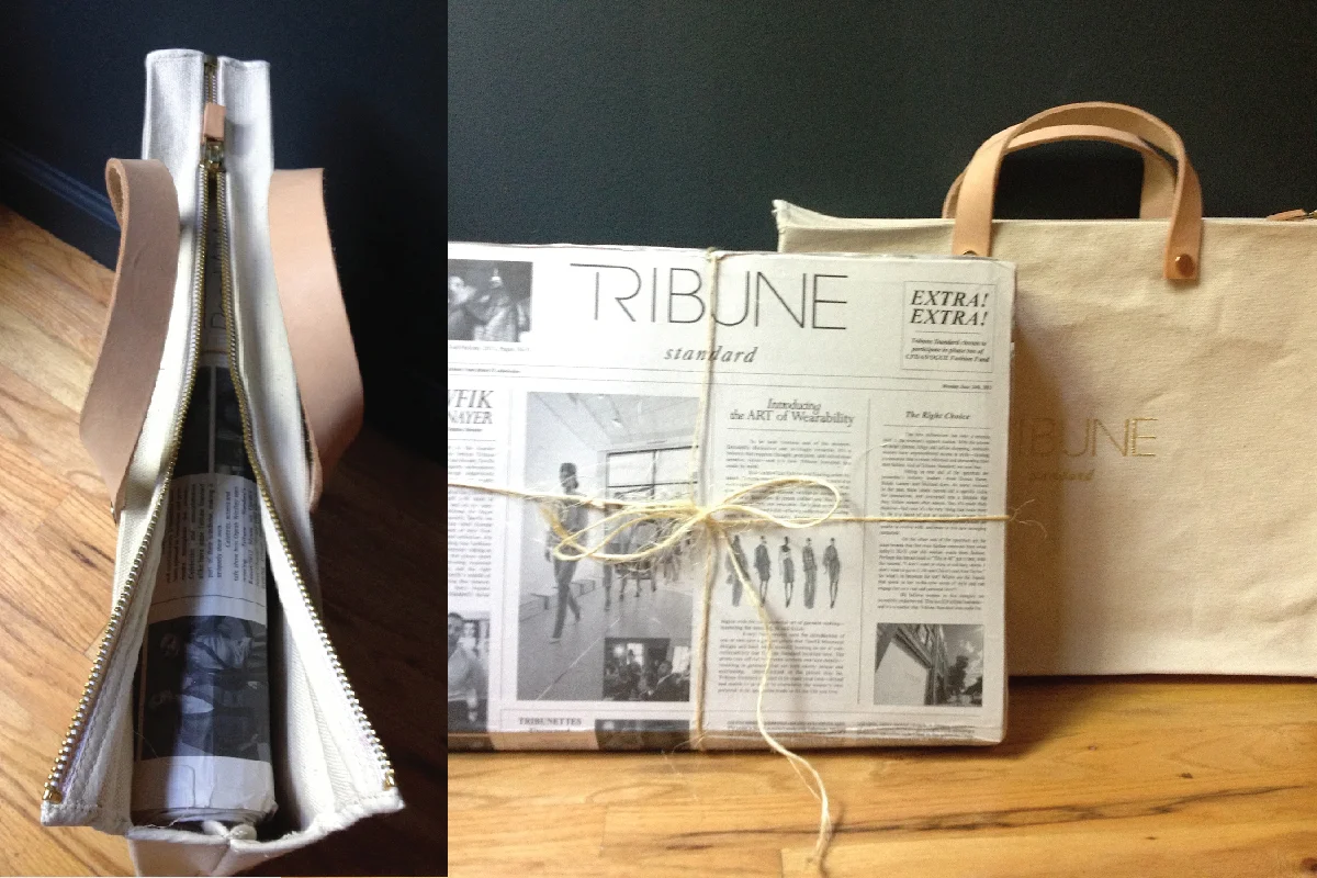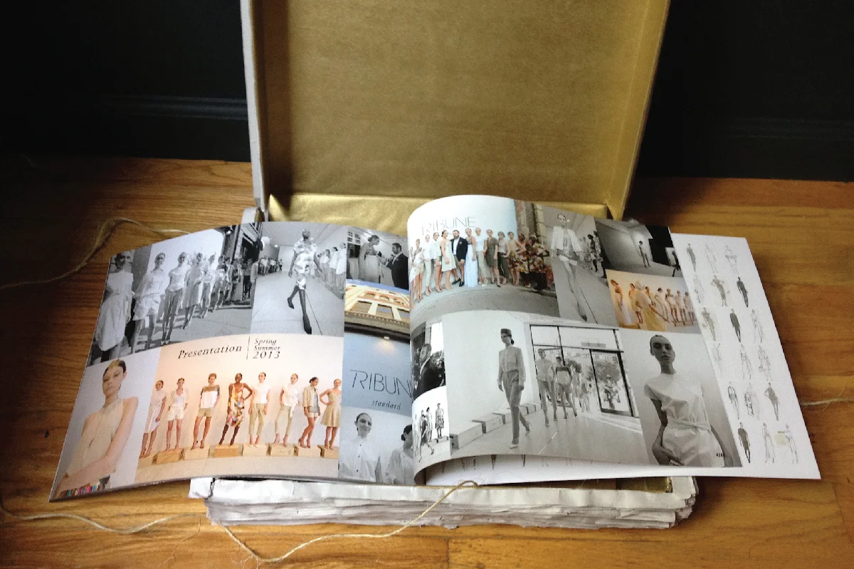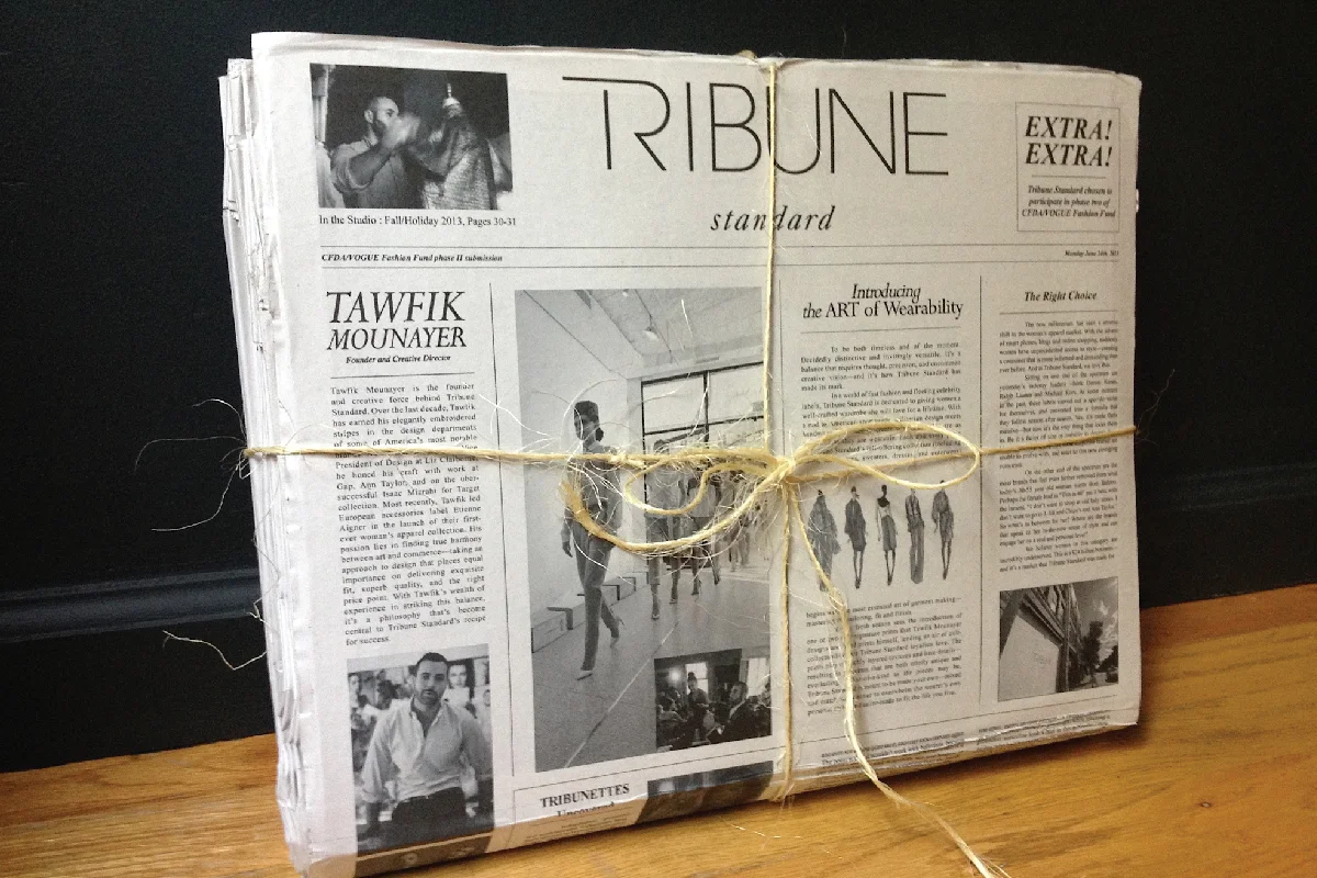 CFDA Submission, Brand Book: Book presented in a clamshell box that closed was made to look like a stack of newspapers tied with twine. Designed the book itself and newspaper outer shell. Newspaper stack concept, newspaper box assembly and canvas bag by Tawfik Mounayer of Tribune Standard. Art directed and photographed select behind the scenes photography used in the studio sections.